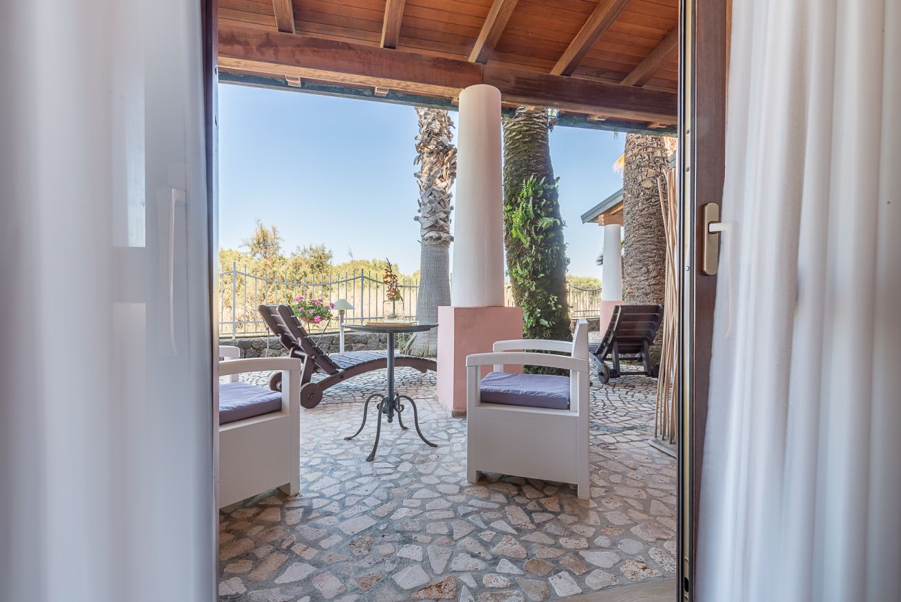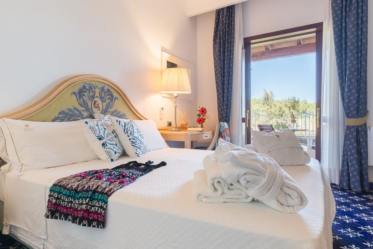 Camera accessoriata di aria condizionata, wi-fi, tv, minibar, cassaforte, patio privato attrezzato con tavolo e poltroncine in vimini.